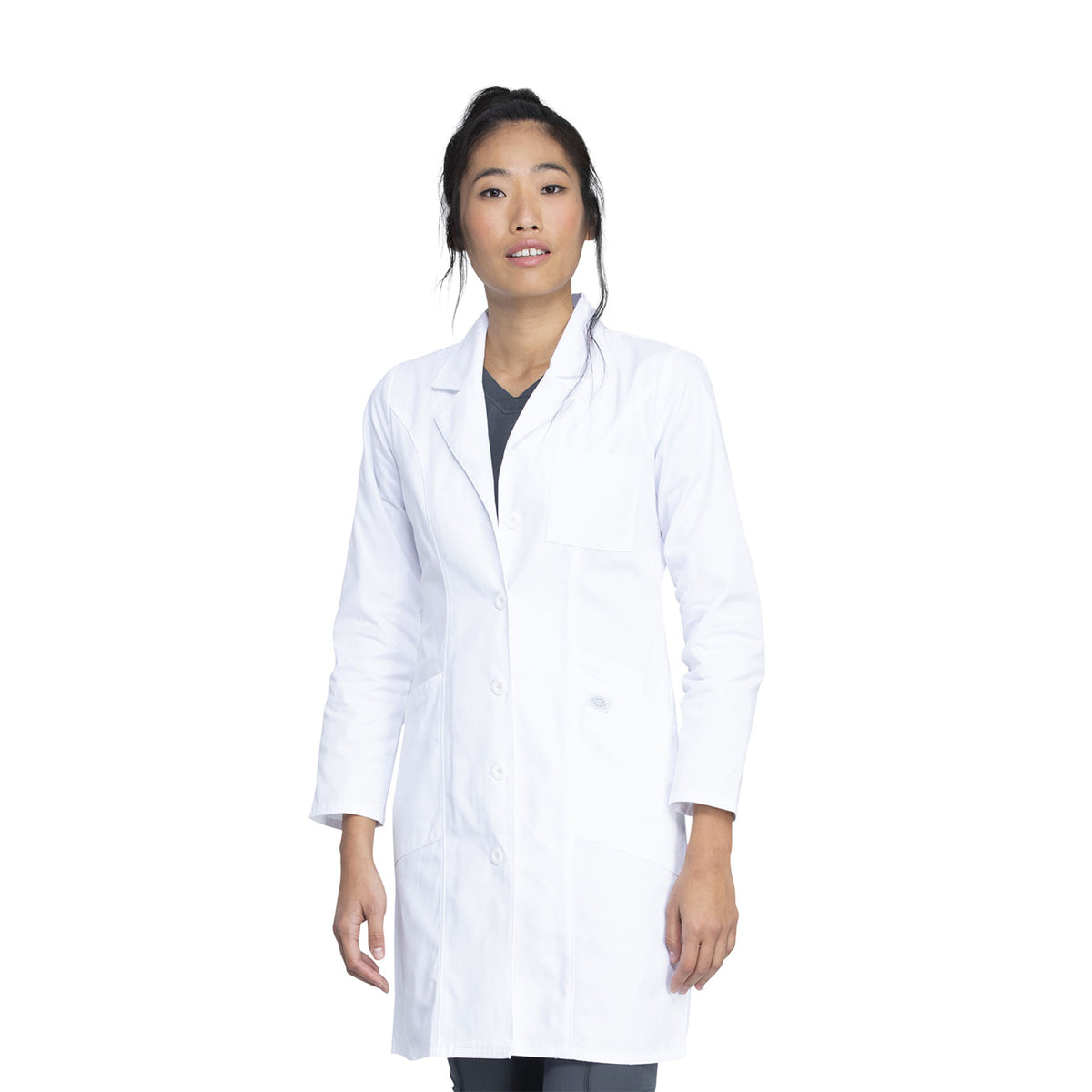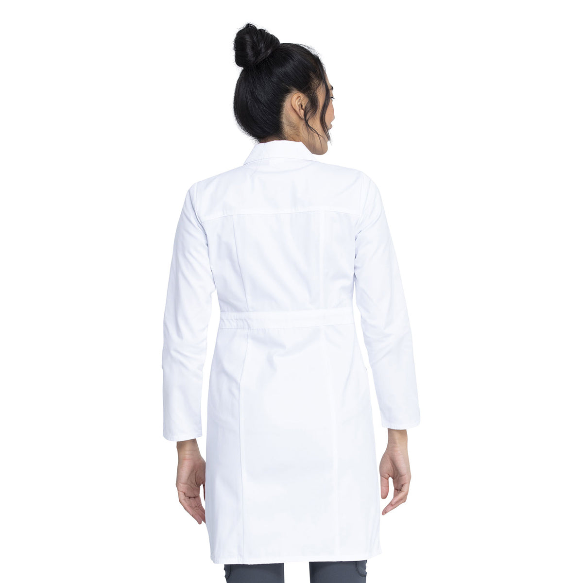 A Contemporary fit button front lab coat features notched lapels and four patch pockets (one chest pocket, two front angled pockets and one cell phone pocket) with a hidden instrument holder inside the right pocket. Back princess seams and a sewn down back belt complete this picture. Center back length: 37". Imported.