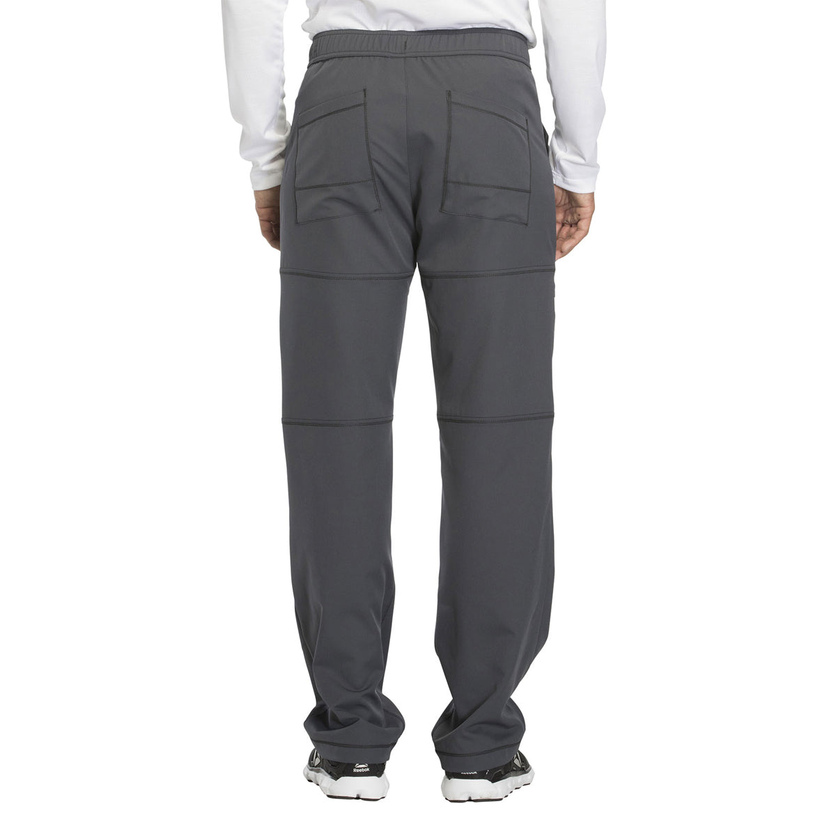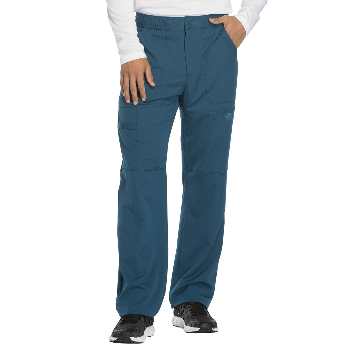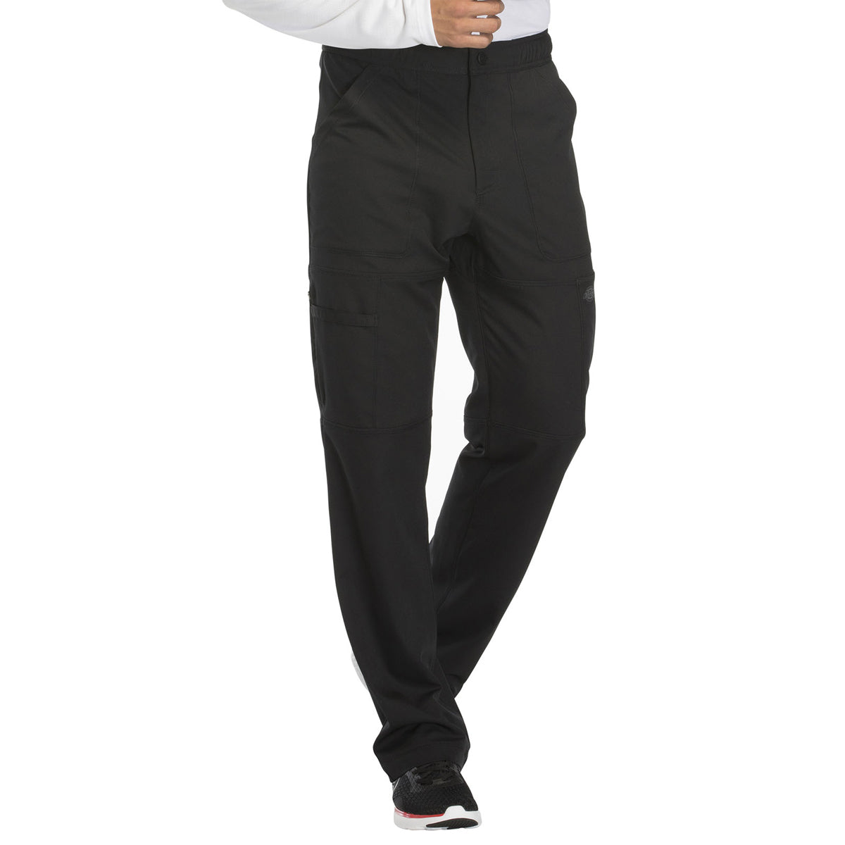 A Men's fit straight leg pant features a functional drawstring, zip fly with front button closure and a hidden inseam gusset for an easy fit. Also featured are front angled pockets, patch back pockets, cargo pockets (the right with zip closure and instrument loops, the left with a tonal logo heat transfer) and cover stitch detail throughout. Leg opening: 18". Inseam: 32". Imported.