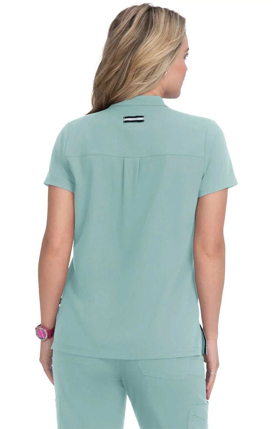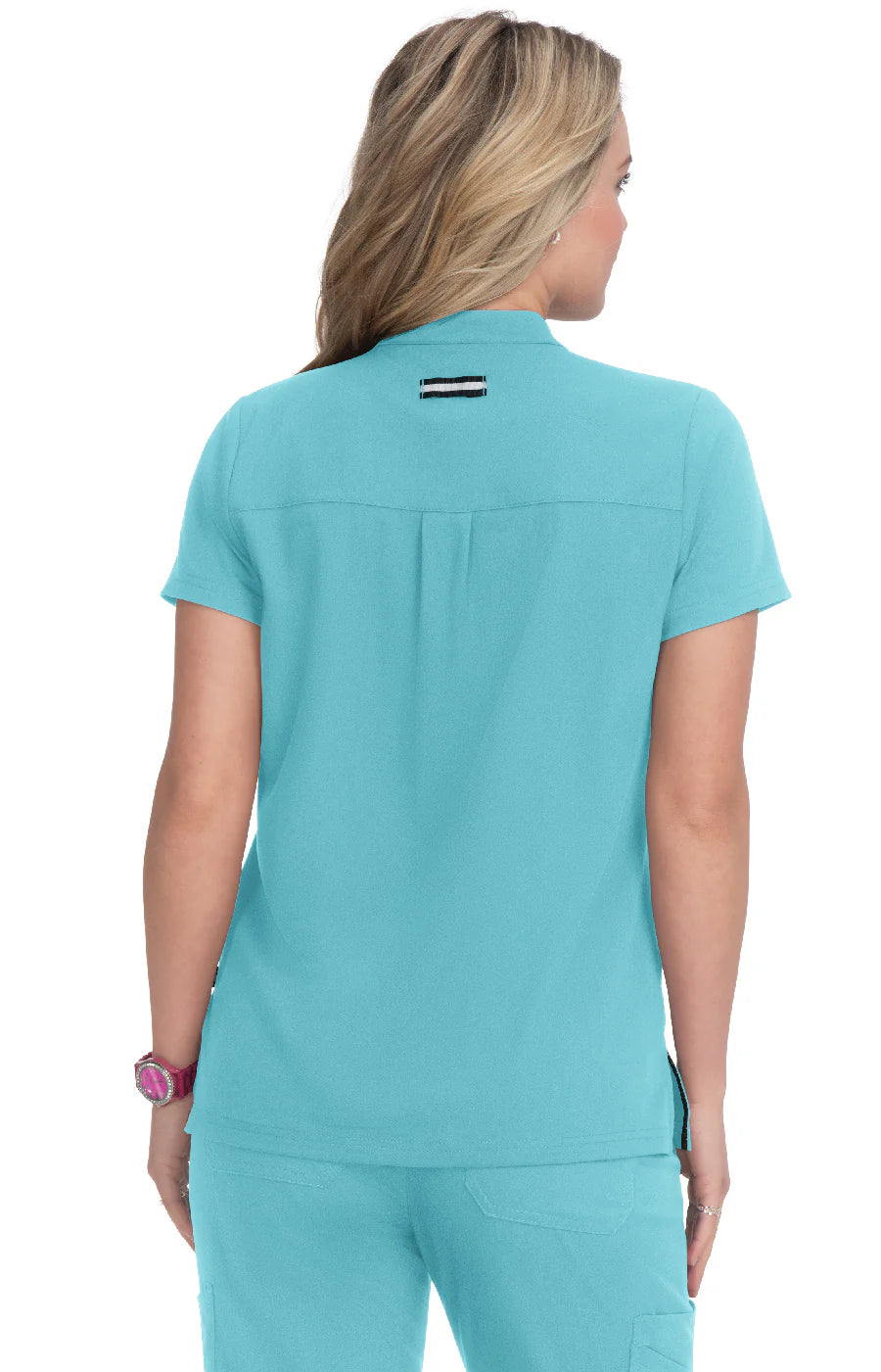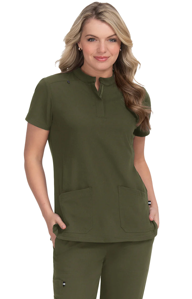 Be unique in this modern scrub top with Mandarin collar. Contemporary fit.