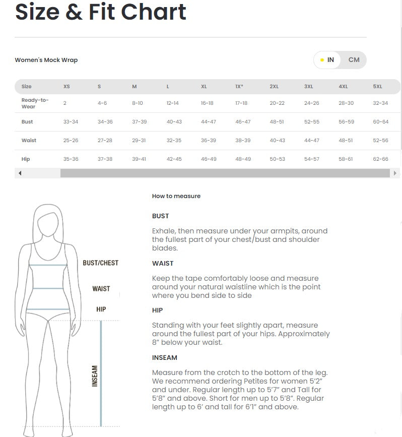 • Mock-wrap construction with above-the-bump elastic and tie on front