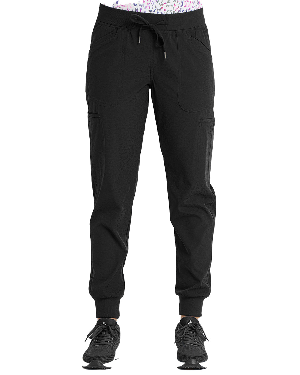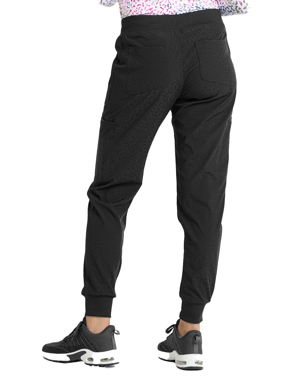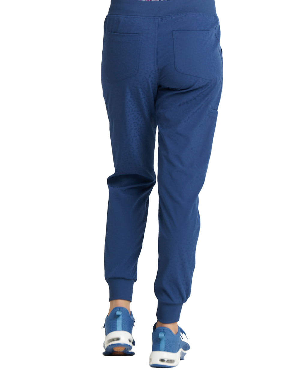 Tapered jogger pant leg with rib knit cuffs